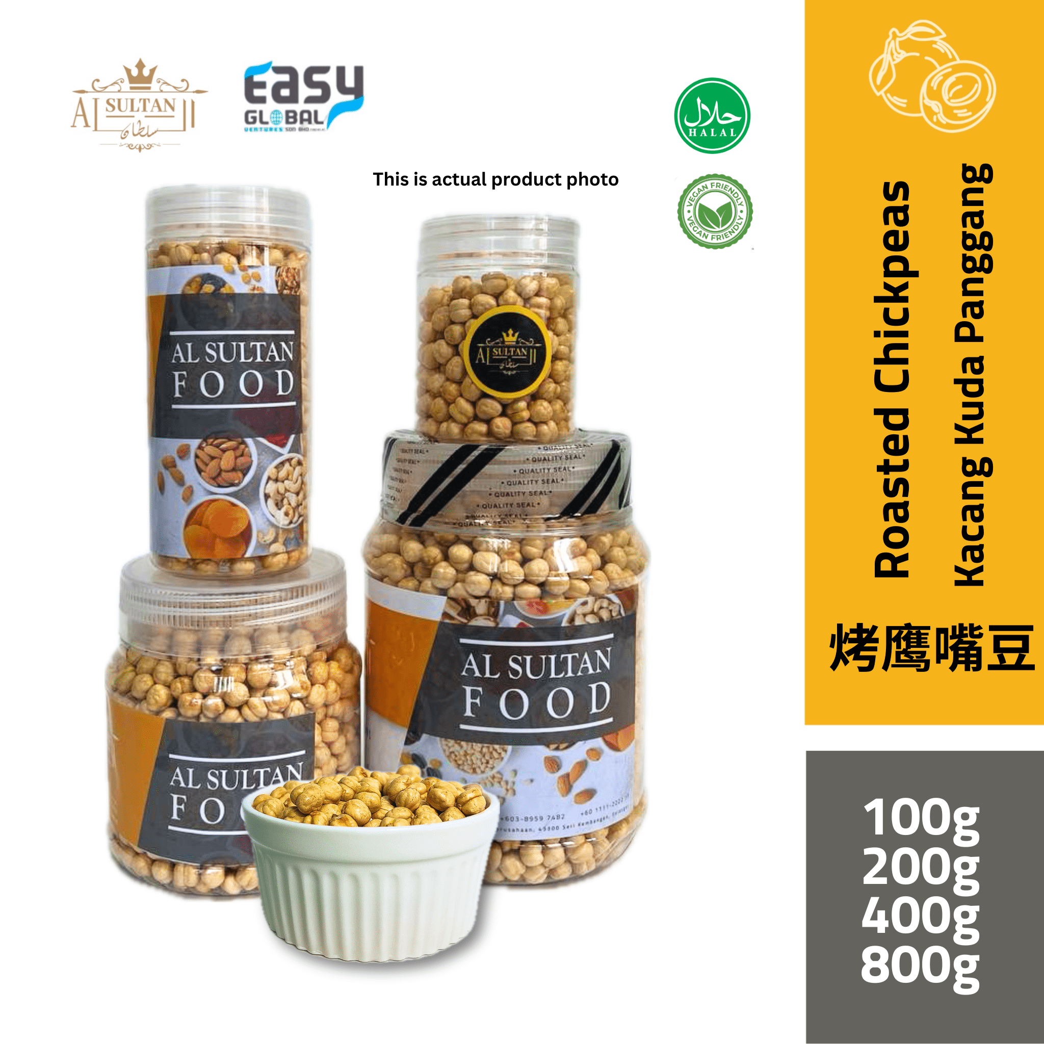 Kacang Chickpeas Panggang Al-Sultan adalah snek yang rangup, sihat, dan penuh dengan kebaikan. Dipanggang dengan teliti, kacang ini kaya dengan protein dan serat, menjadikannya pilihan snek yang mengenyangkan dan sesuai untuk gaya hidup sihat.